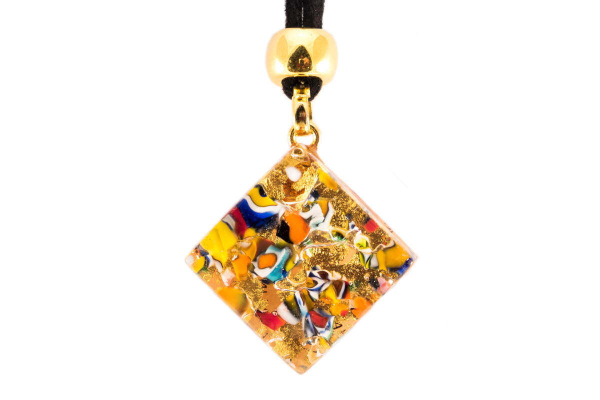 This unique pendant is made by hand using golden crackelure and Murino - colored figured elements that are located inside the decoration. This is the proprietary technology of Muranoglass blowers Murano, also called Millefiore.