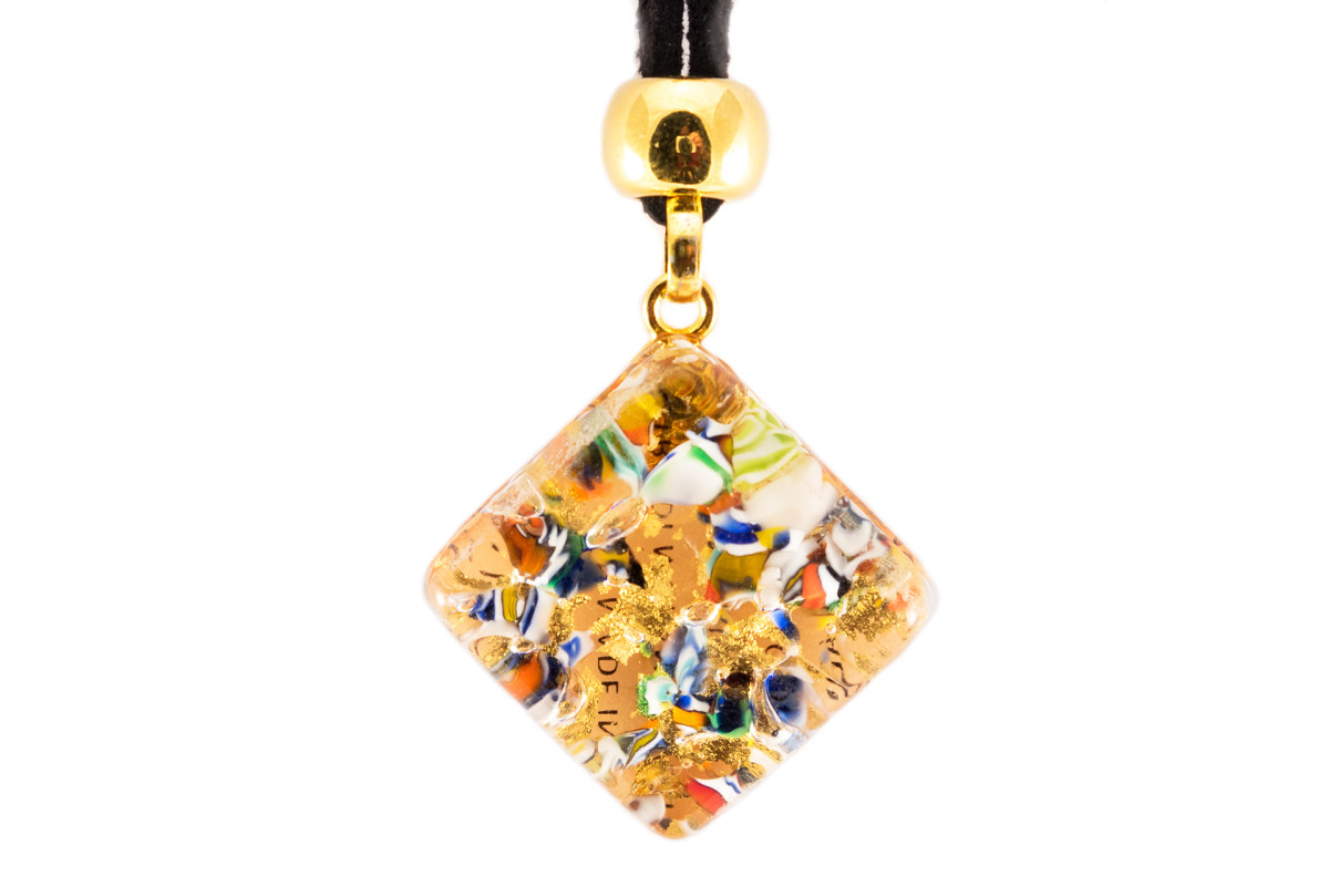 Este colgante único está hecho a mano con craquelado dorado y elementos figurados de color Murino que se encuentran dentro de la decoración. Esta es la tecnología patentada de los sopladores de cristal de Murano, también llamado Millefiore.